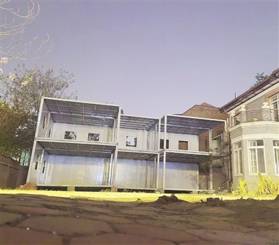 来到重庆道89号楼,记者看到该楼位于重庆道与衡阳路交口,处在旅游繁华路段,站在院墙外就能清晰地看到彩钢房。89号院墙上挂有两个牌子,一个牌子上写有“天津市历史风貌建筑”字样,另一个牌子上写有“重庆道89号楼 天津市和平区不可移动文物”字样。同时,一张由天津市和平区住建委出具的历史风貌建筑告知书异常醒目地贴在院门上,上面明确写着“重庆道89号房屋为文物保护单位,如果需要施工修缮,需要按照相关法律法规向文物保护部门申报”。透过门缝可以看到,紧贴着89号楼一侧建有上下两层的彩钢房,主体框架已搭建完成,面积约有一 百平方米。