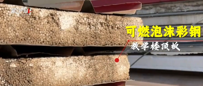 教学楼顶板使用可燃泡沫彩钢。图源:新京报可燃泡沫用打火机一烧立即燃烧