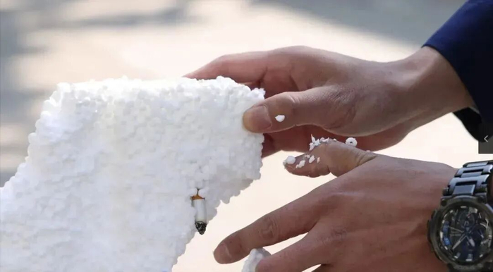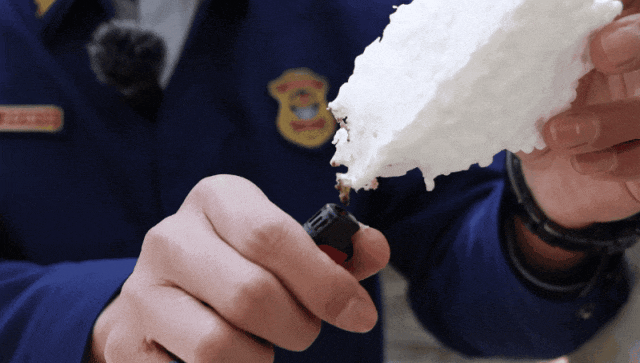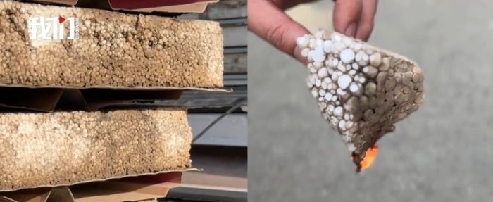 可燃泡沫用打火机一烧立即燃烧。图源:新京报由聚苯乙烯、聚氨酯泡沫等