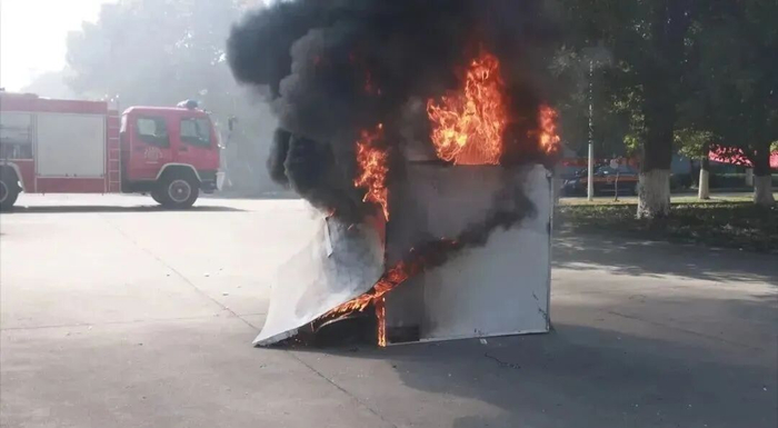 在试验中,消防员用泡沫夹芯板搭建起一个箱子,模拟厂房。当消防员点燃其中一角时,可以看到,彩钢板迅速被引燃,大量毒气冒出。