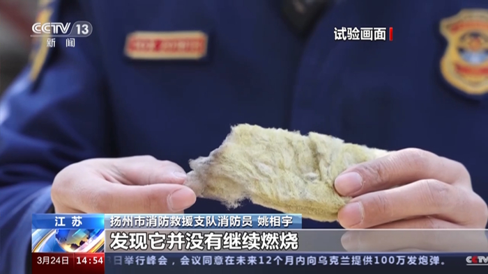 消防员将岩棉、泡沫分别接触发生短路的电线,也发现了相似结果。